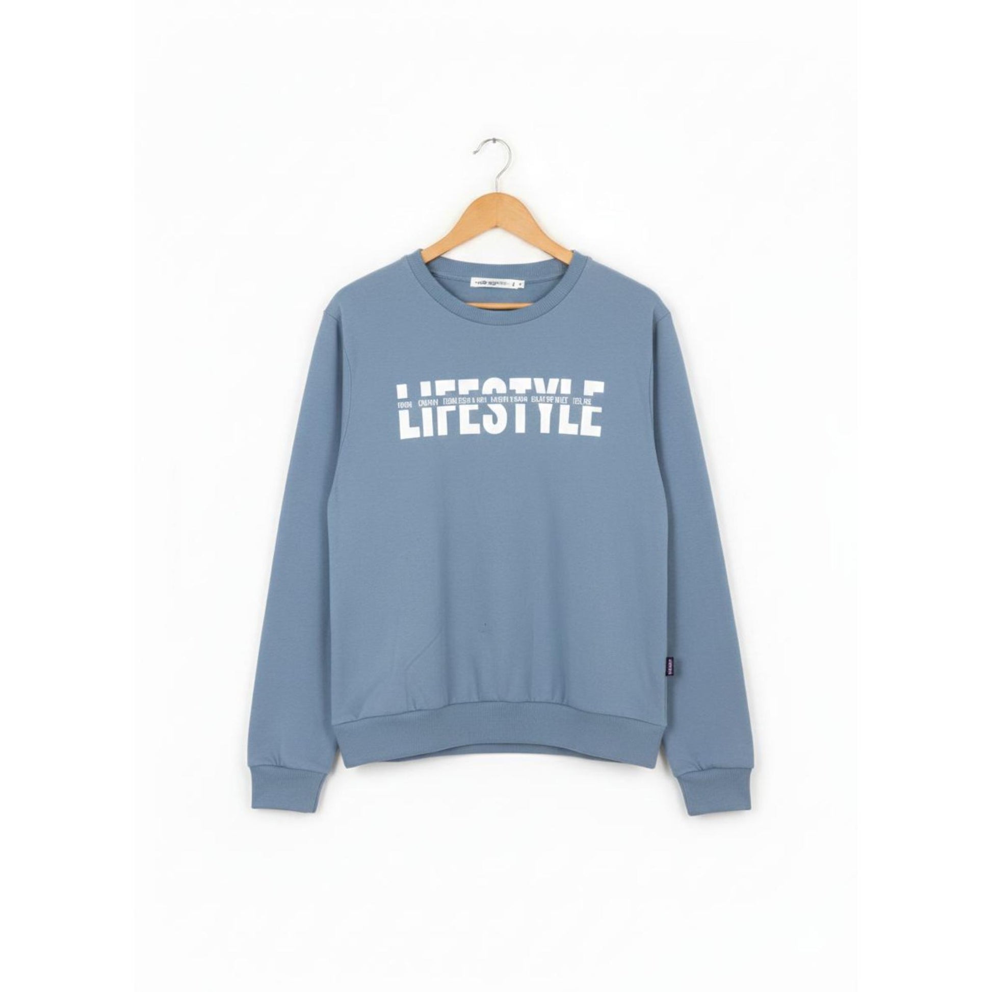 This steel blue crewneck sweatshirt offers a simple yet stylish look with a bold “Lifestyle” text print on the front.